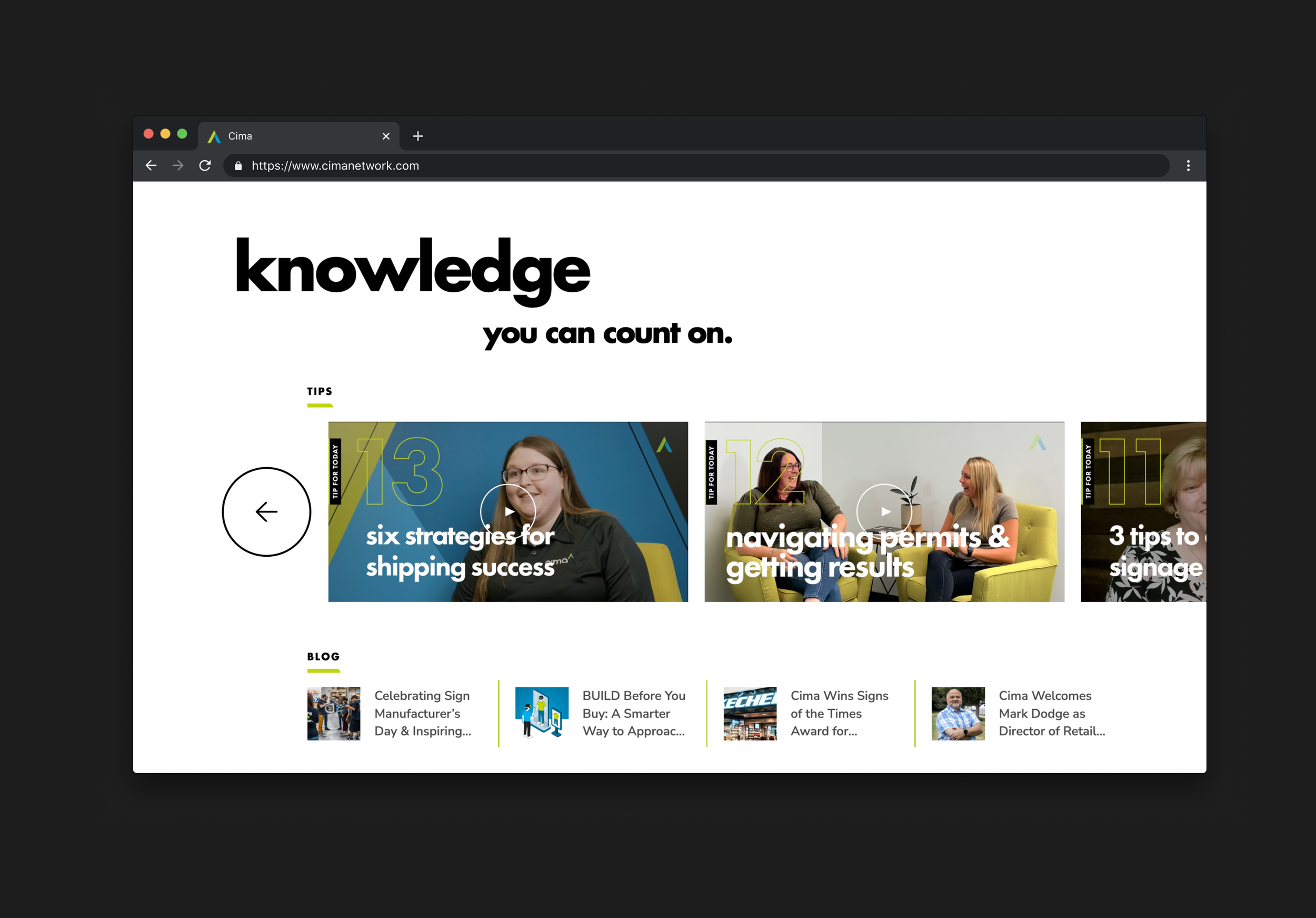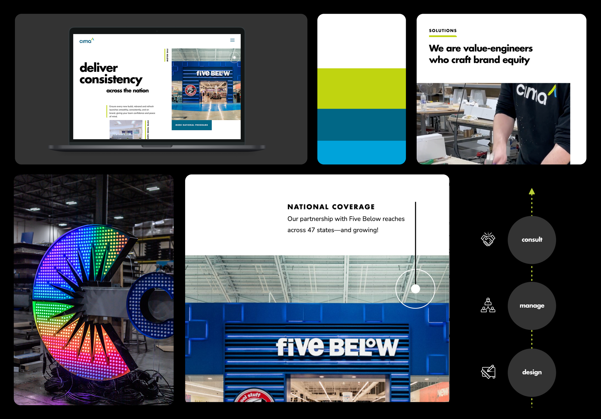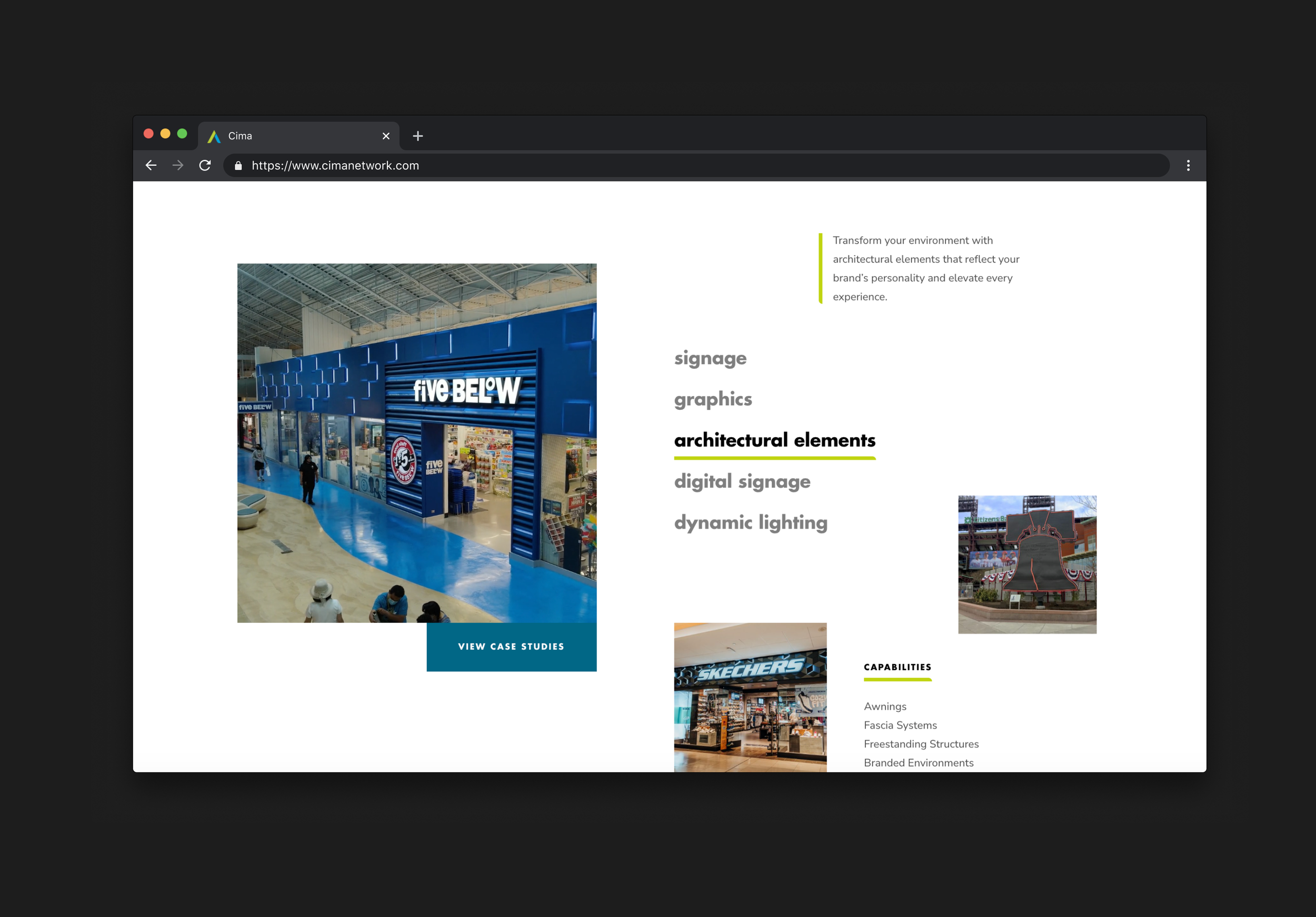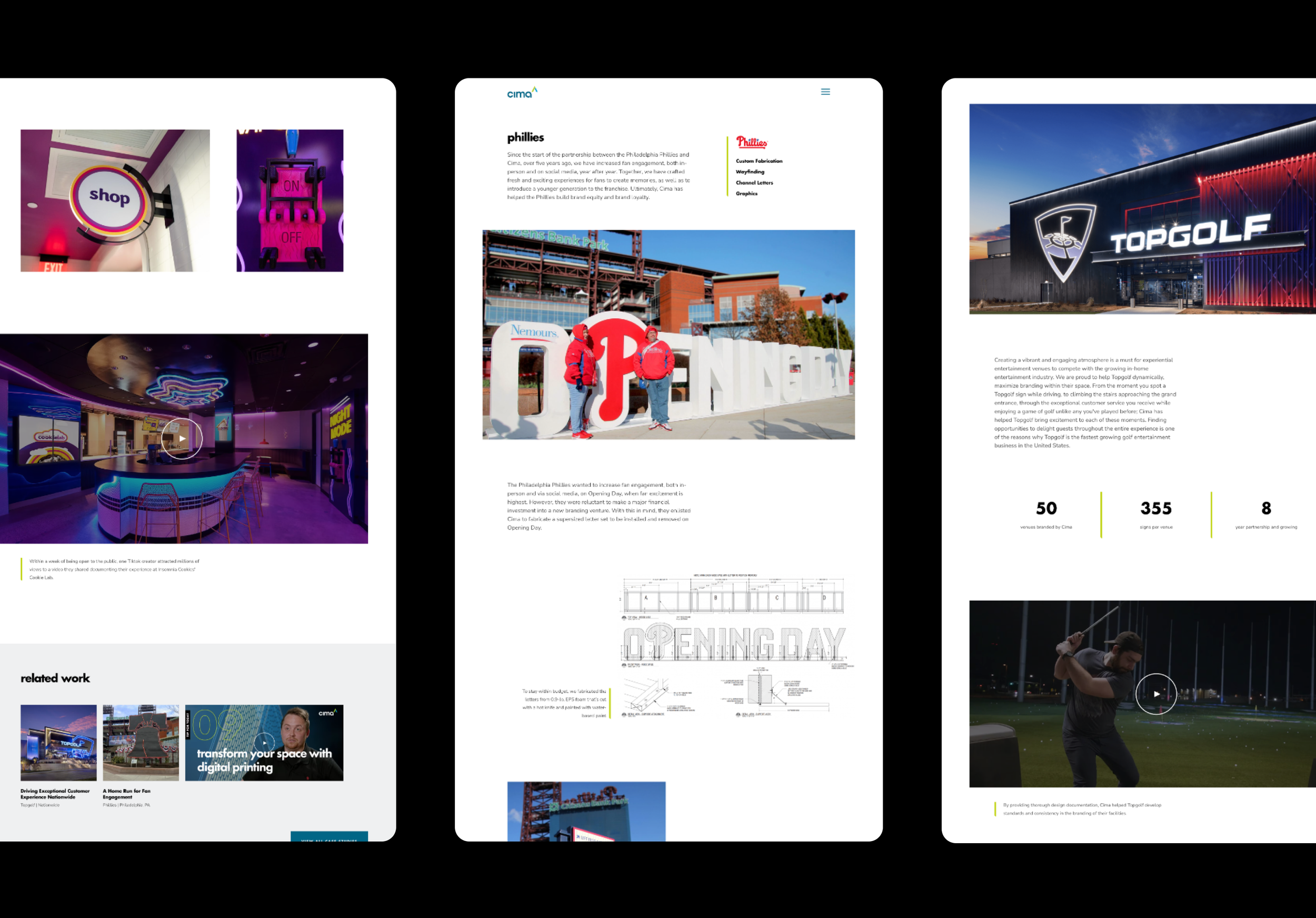 Website redesign for Cima Network, leveraging existing brand elements with thoughtful micro-interactions and modular case studies to showcase their industry-leading signage and environmental branding work for brands like Walgreens, Pep Boys, Topgolf, the Philadelphia Phillies, and Regal Cinemas.