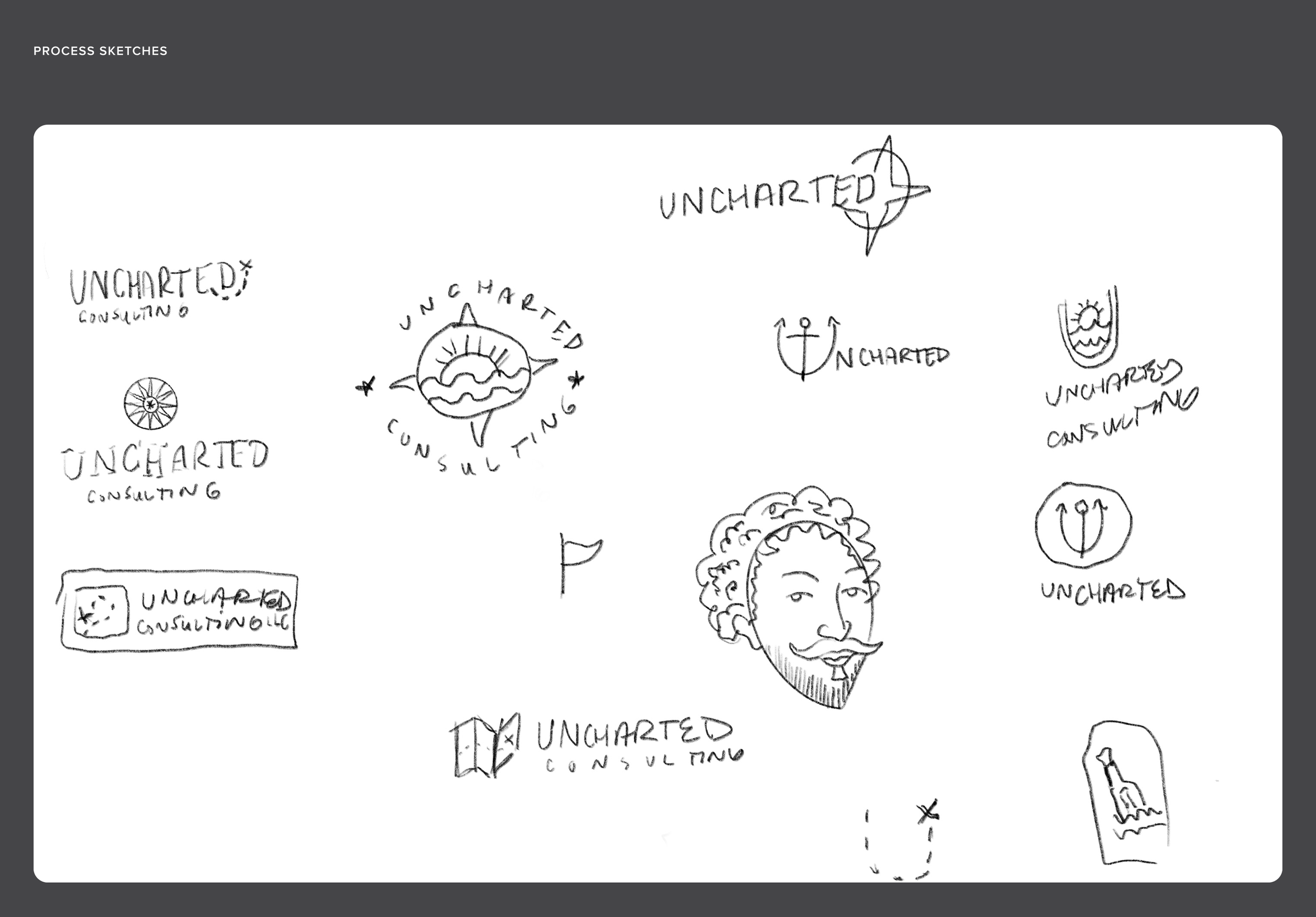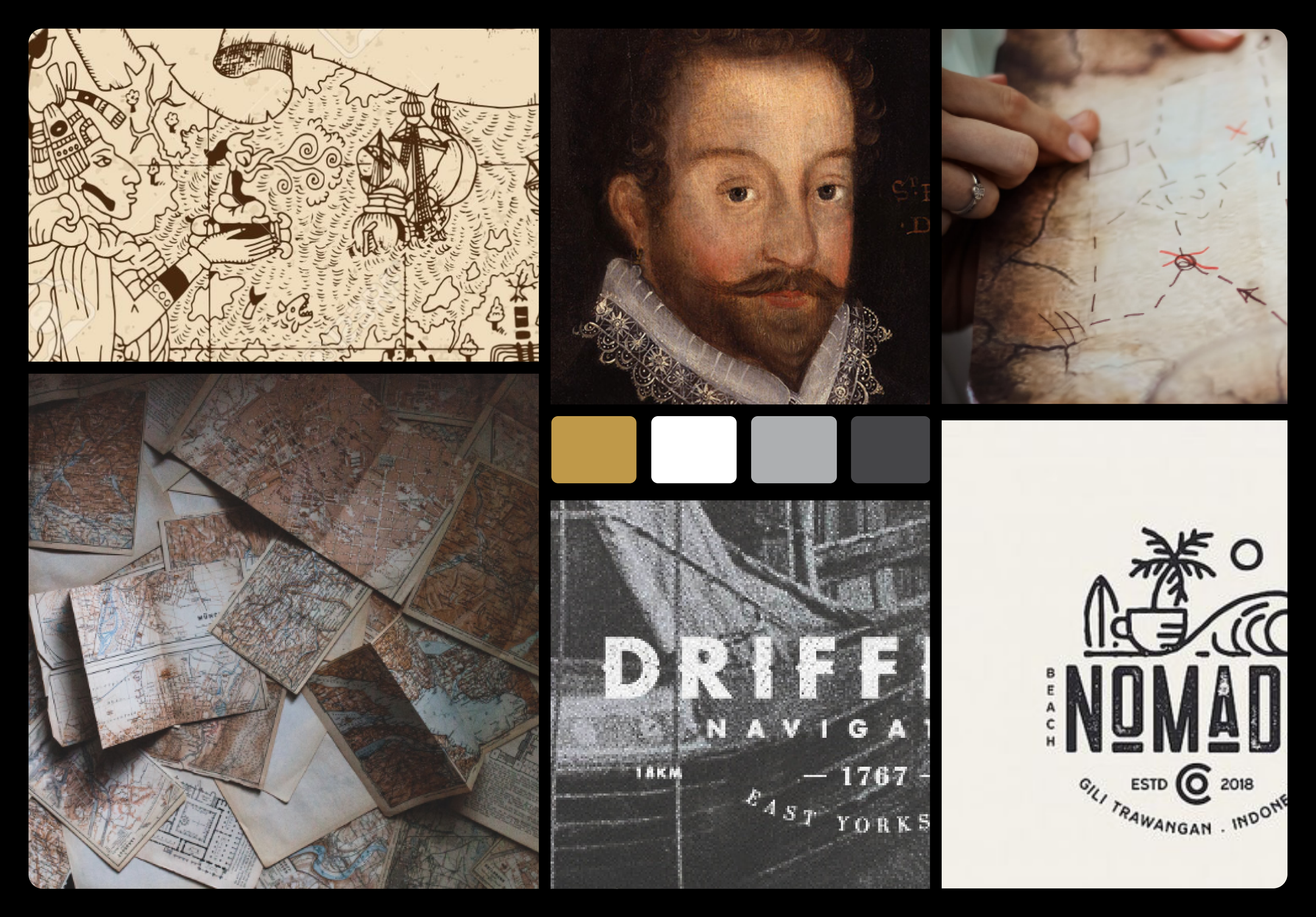 A moodboard to inform the visual identity, drawing inspiration from vintage maps and exploration literature to shape the mark and connect it to the business name.