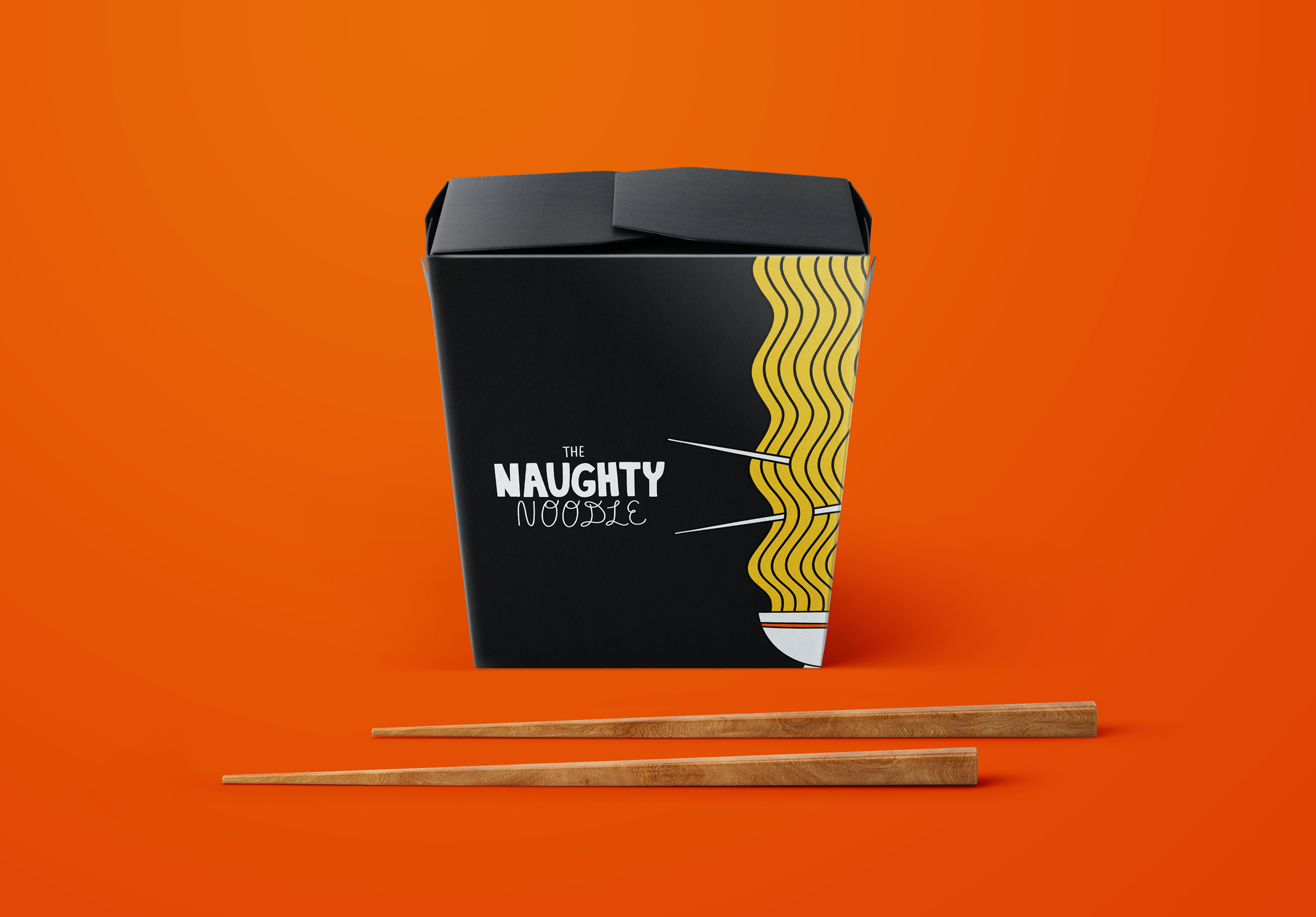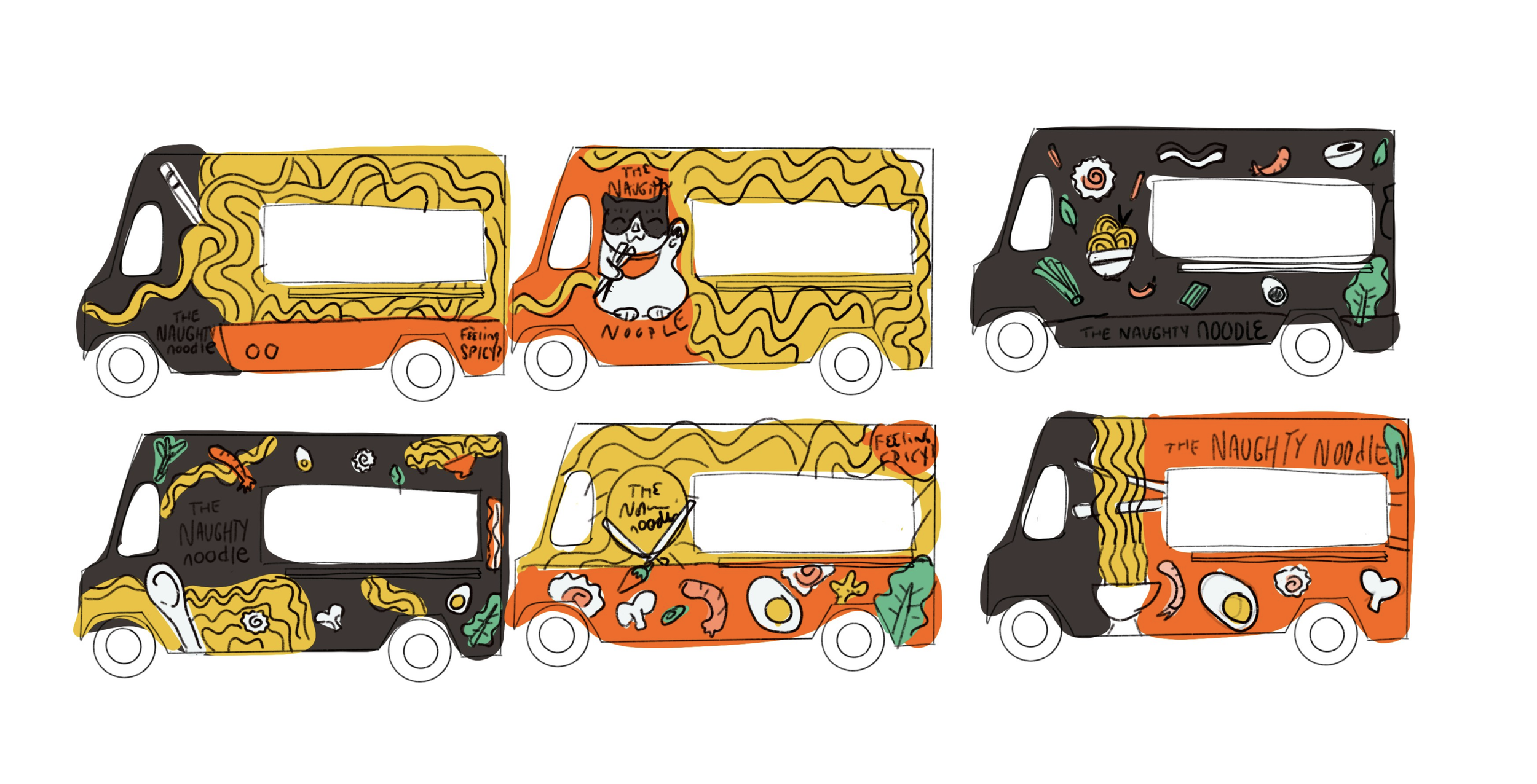 Visual identity and custom food truck illustrations for Naughty Noodle, a mobile concept focused on all things noodles. The project included logo design, illustrated food graphics, menu design, and packaging.